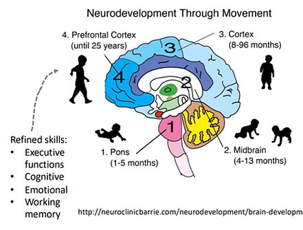 Начало развития головного мозга ребенка приходится на стволовые отделы (мост, средний мозг), затем созревают кора и префронтальная кора. Движение и опыт стимулируют этот рост.